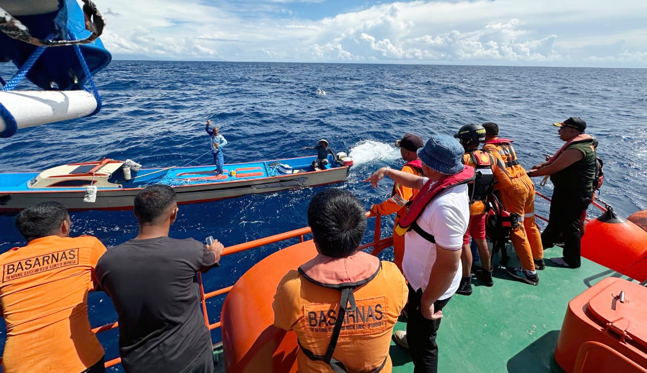 “Pukul 13.55 WIT, tim berhasil menemukan dua korban di koordinat 0°54’20″N / 126°59’41″E dalam keadaan selamat. Sementara perahu mereka telah tenggelam,” ujarnya.